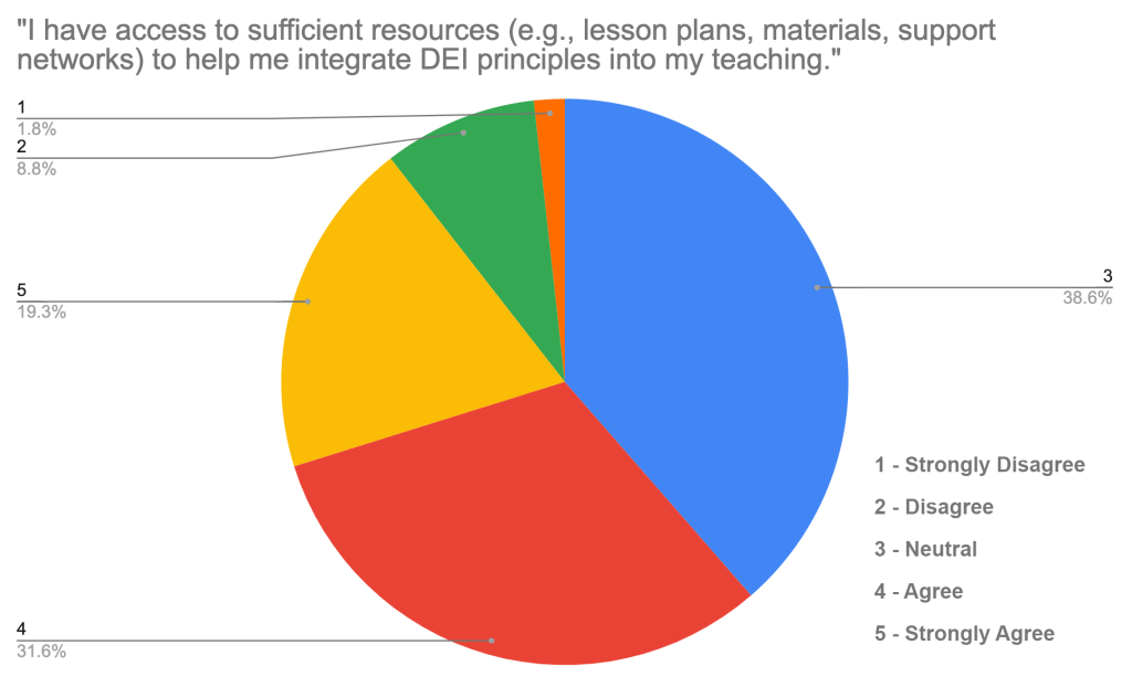 An equal number of respondents felt supported by school and district leadership in their efforts to promote DEI in their classrooms. This suggests that there is a foundation of support in place for many educators, which is essential for fostering a school culture that prioritizes DEI.